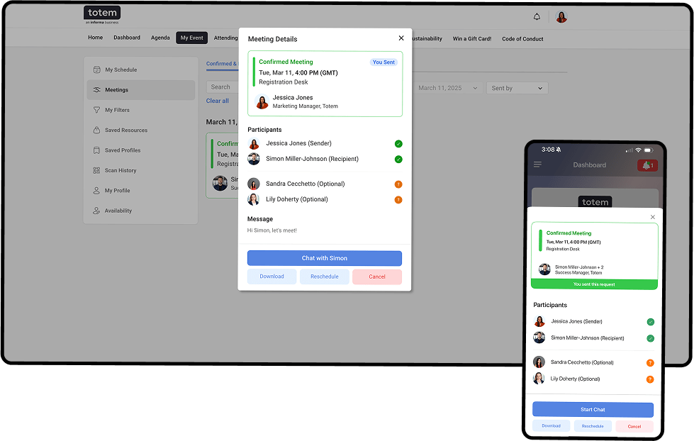 Meetings and Networking, manage meeting requests in your built-in calendar. Schedule meetings around essential sessions and commitments, with flexibility to book in-person or online.