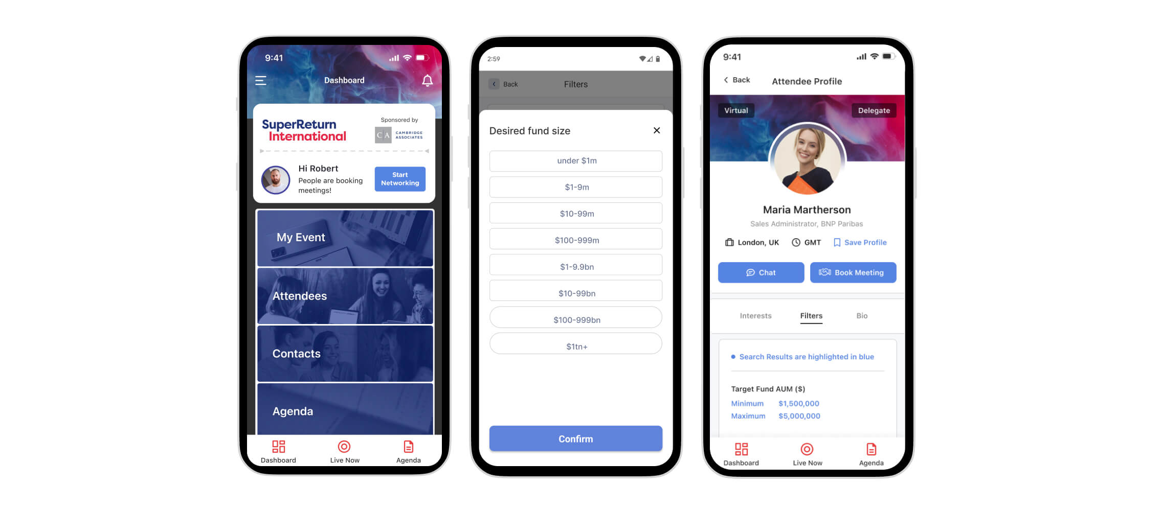 Prior to the event getting underway, attendees could create, save and modify filtered searches of the attendee list and reach out to delegates, or speakers directly to chat or book meetings onsite.